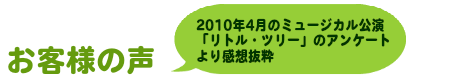 - 20代女性会社員:歌のCDを出して欲しいと思います。歌がすばらしく鳥肌が何度も立ちました。とても楽しかったです。また観れたらいいなと思います。